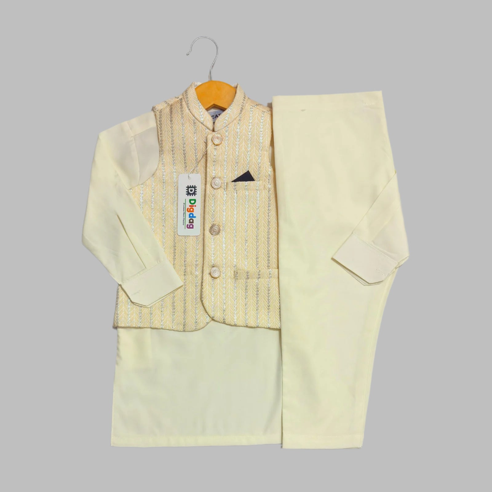 Give your child a sophisticated look with a kurta pajama with a waistcoat. The Cream Designer Waistcoat pairs perfectly with a cream kurta pajama, making it an ideal choice for weddings, festive occasions, and celebrations. For a stylish variation, explore our Embroidery Navy Kurta Pajama for a rich, traditional appeal, or opt for a Light Brown Kurta Pajama for a warm, classic touch.